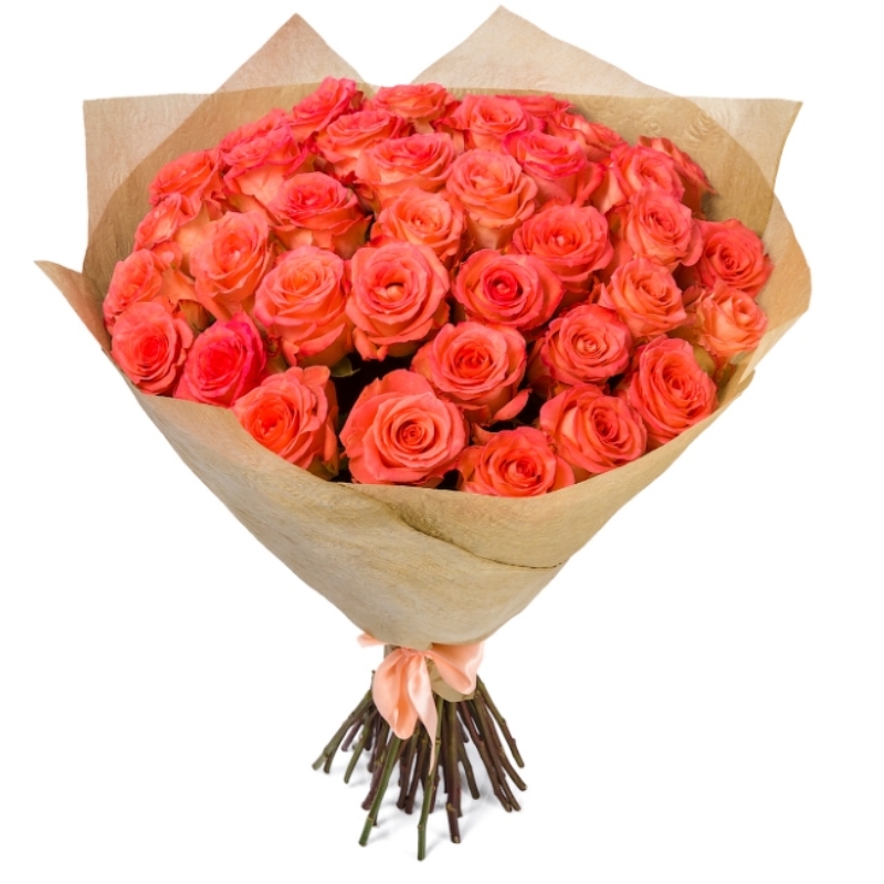 Букет состоит из 35 оранжевых роз, крафт, атласная лента.